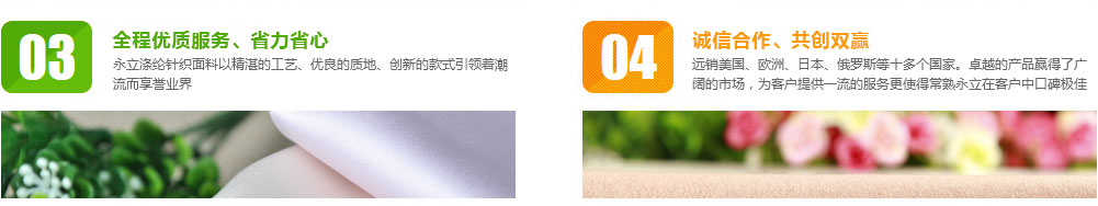 公司成立于1997年,坐落于風(fēng)景秀麗的虞山腳下,位于中國(guó)經(jīng)濟(jì)最活躍的版圖--長(zhǎng)江三角洲經(jīng)濟(jì)技術(shù)開發(fā)區(qū)的黃金地段上,常熟市永立針紡織有限公司,伴隨著中國(guó)針紡織品行業(yè)蓬勃發(fā)展,走過了10多年的創(chuàng)業(yè)歷程,如今已發(fā)展成為一家集工、貿(mào)于一身,在行業(yè)內(nèi)聞名遐邇的專業(yè)生產(chǎn)滌綸針織面料的特色企業(yè)。本公司擁有來自臺(tái)灣的先進(jìn)制造設(shè)備,以雙面小提花機(jī)為主的34寸(16--45針)雙面緯編機(jī)50臺(tái)、34寸(20--50針)單面開幅機(jī)9臺(tái)、36寸 22針德國(guó)邁耶OVJE雙面電腦大提花機(jī)6臺(tái)及其他先進(jìn)設(shè)備。憑借著一流的設(shè)備,以及“人無(wú)我有,人有我好,人好我轉(zhuǎn)”的經(jīng)營(yíng)理念,常熟永立一直致力于滌綸面料的創(chuàng)新...